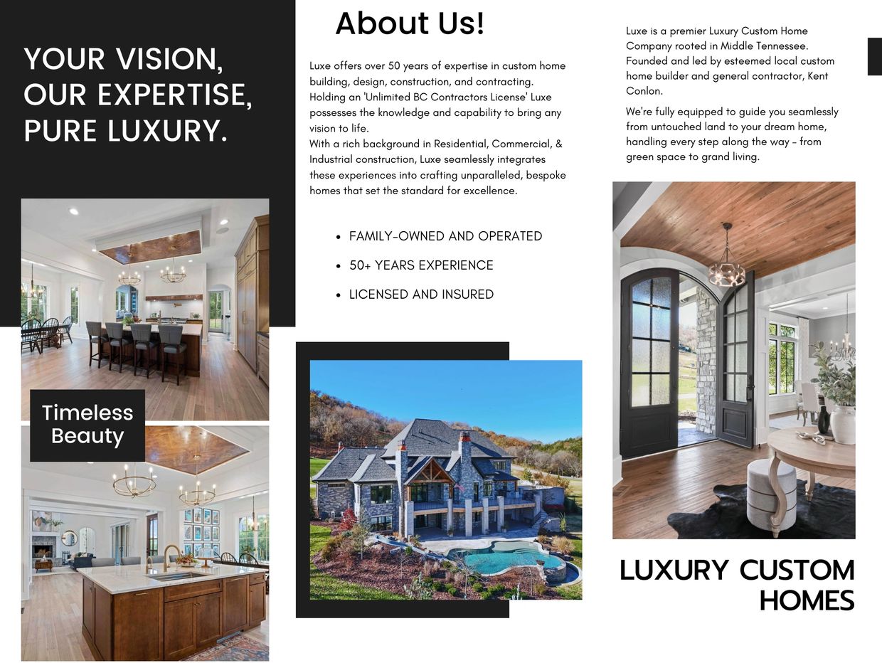 Luxe Custom Builds is Middle Tennessee’s premier luxury home builder, founded by renowned general contractor and custom home expert Kent Conlon. We specialize in turning raw land into refined living—guiding you from untouched acreage to a fully realized dream home with precision, care, and craftsmanship. From concept to completion, we manage every detail so you can enjoy the process, stress-free.
